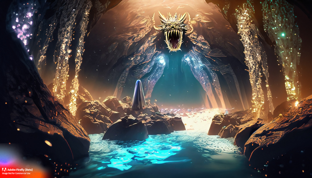 A glittering cavern with a person inside looking into the bowel of the abyss.