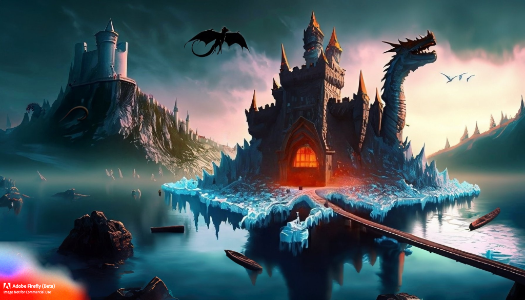 A castle in the middle of a lake that looks like a burning aligator breathing fire as a dragon