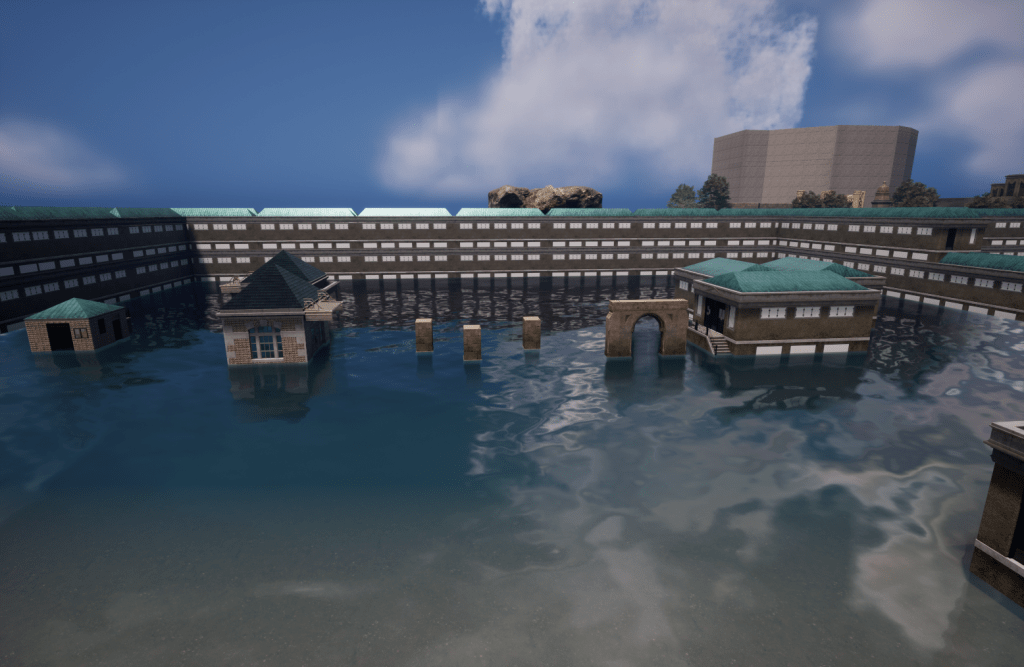• Players will find themselves amidst a flooded city so they must traverse the rooftops to progress in the level. The buildings serve their purpose of verticality and being out of the water because the player will not be able to jump out of the water. Although the inability to jump out of the water is frustrating to the player, players would later feel glad to find stairs so they can continue on the level.